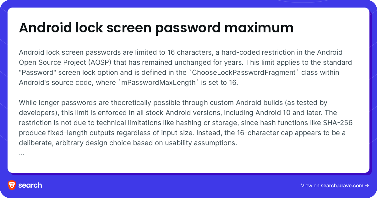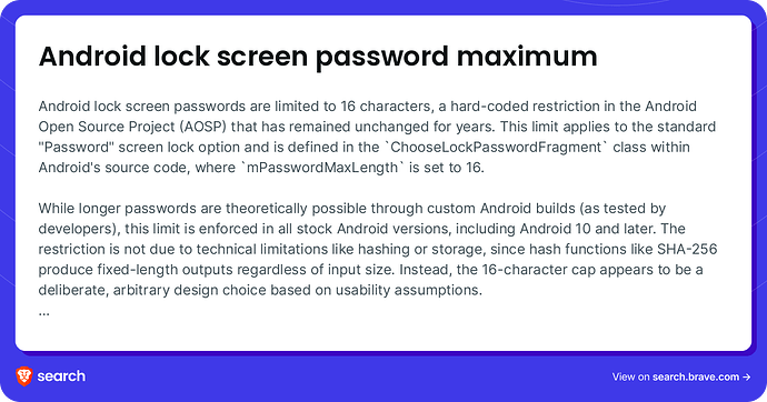 Android restricts lockscreen passwords at 16 characters. Does the BraX3 allow for more? This is what Brave AI says about Android: