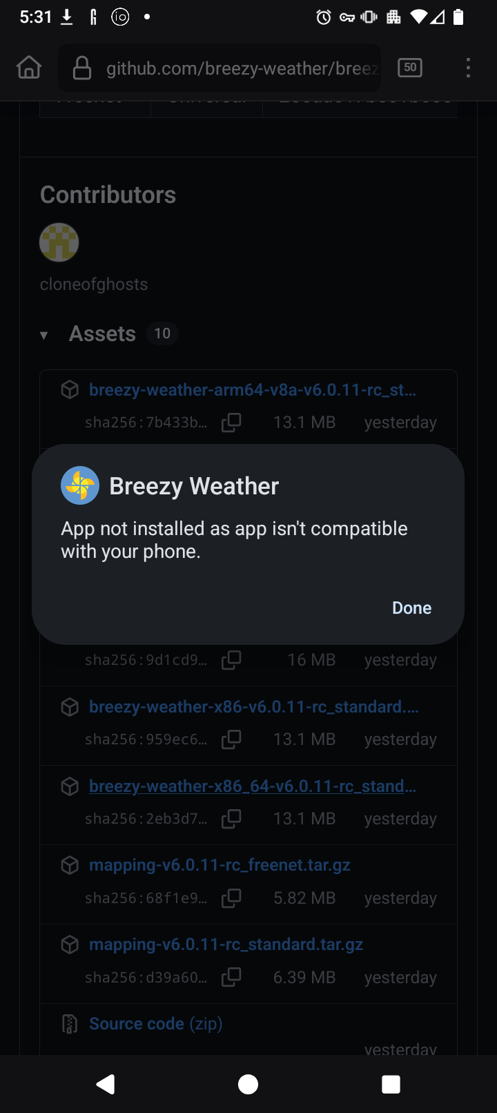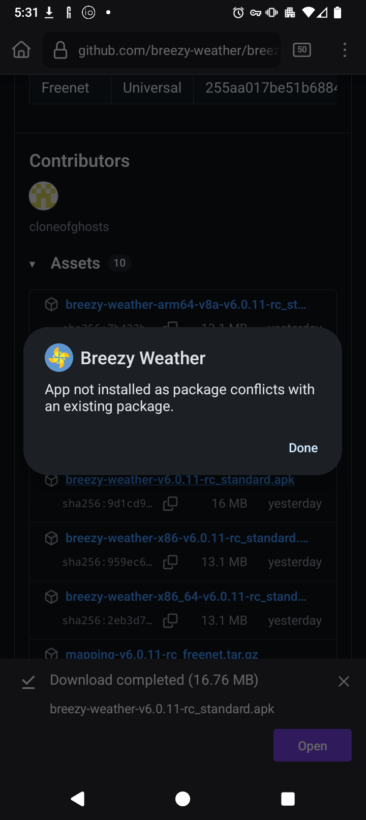 For clarity to thread, I’m getting iode notifications that there’s an update for Breezy. Current breezy version from settings shows version 5.4.8, which Fdroid repos confirms, but doesn’t show an update for. So, when I click download update from the notification, it takes me to github, and I’ve downloaded and attempted all versions even tho I knew which weren’t actually valid, but for all of them I get the errors either 1:“App not installed as app not compatible with your phone” but I don’t need to know why that says that, I get it, just putting here for completeness, or 2:“App not installed as it conflicts with an existing version” and that’s what I don’t understand, what I’m asking about.