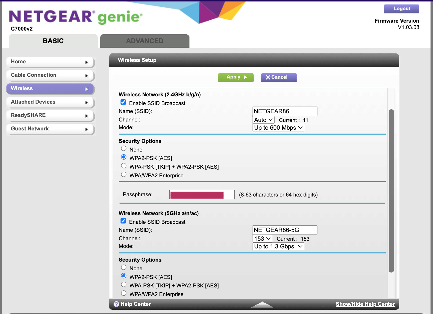 the router’s 2.4GHz and 5GHz networks are set to WPA2-PSK [AES] by