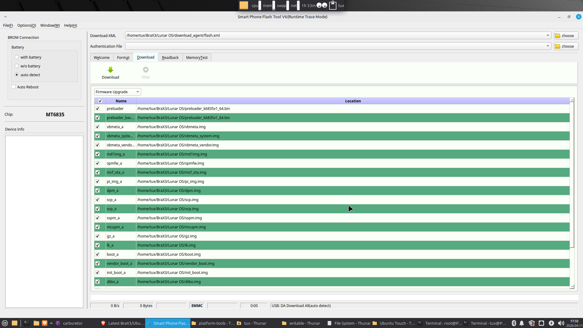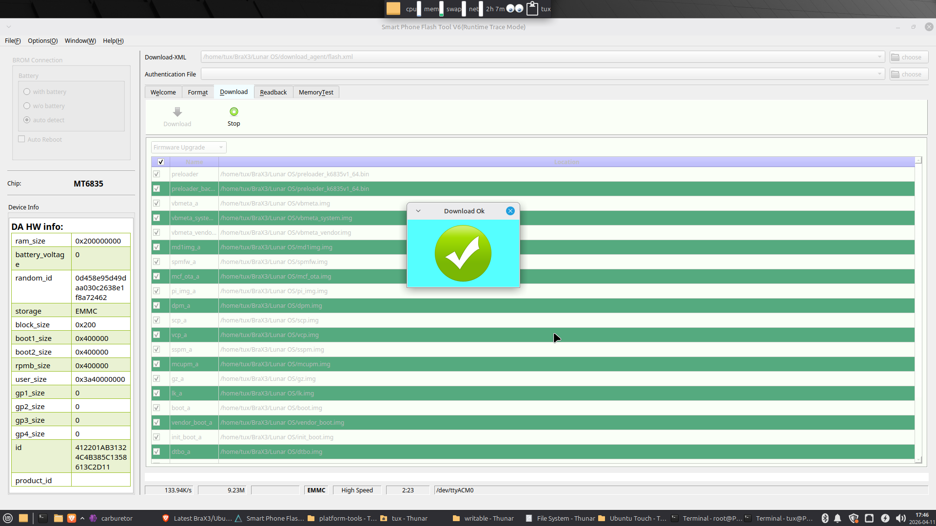 I just tried to use the previous version of SP Flash available from Media Tek which was SP_Flash_Tool_v6.2152_Linux. Same thing-wipes IMEIs when u pick Firmware Upgrade. I didn’t have developer mode activated in Ubuntu Touch this time.