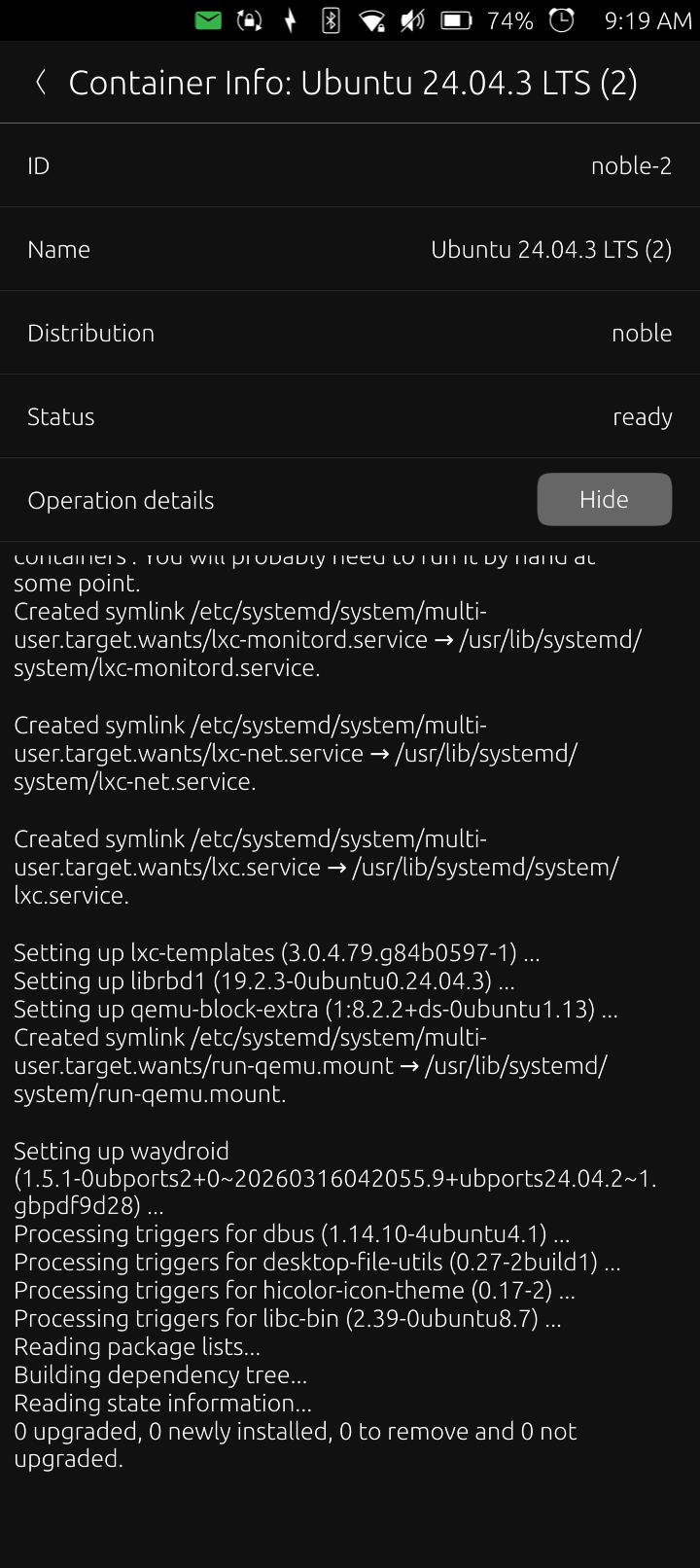 Waydroid is being installed right now inside a libertine container. It takes a while bur I see messages now. Keep the window open and just let the screen time out.