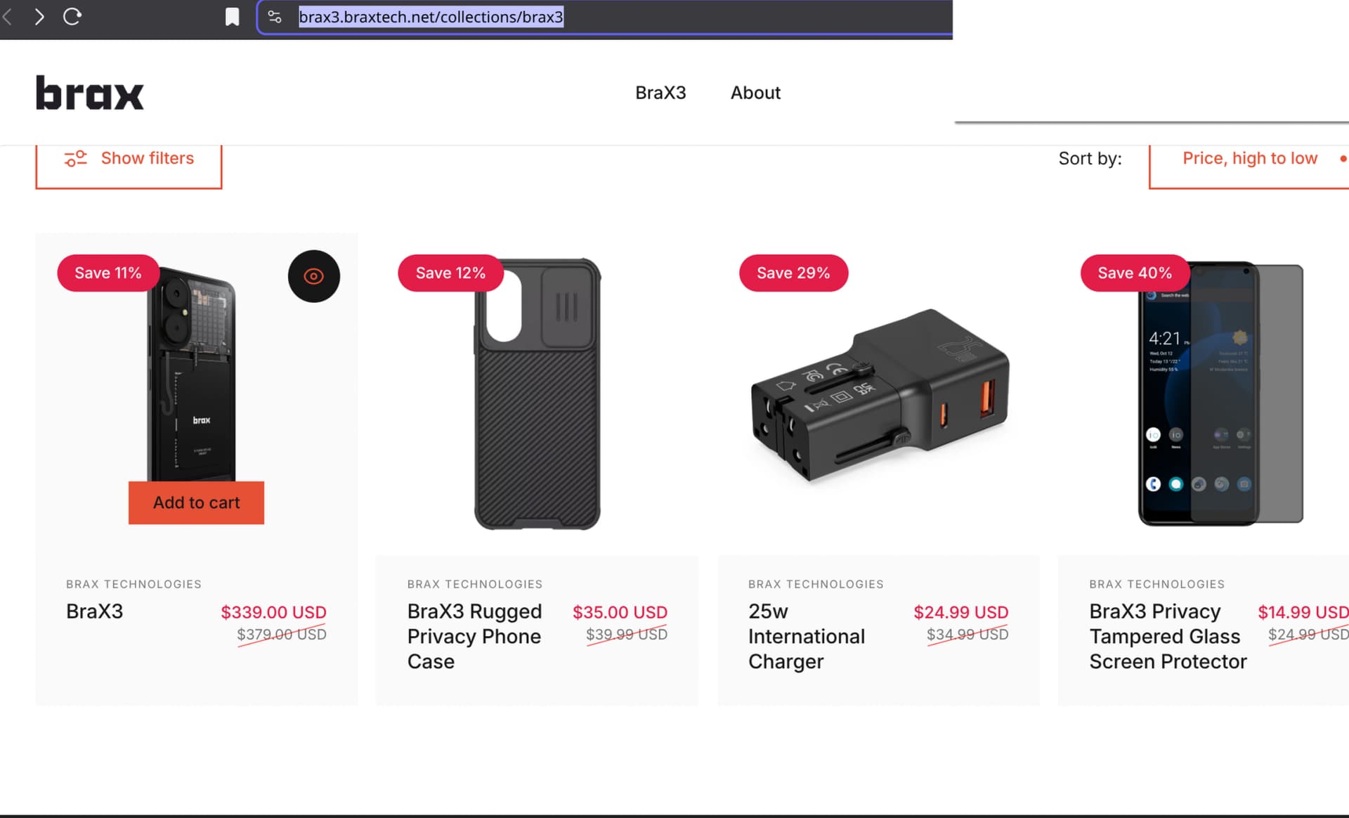 You will see the phone and 3 accessories listed, just mouse over the phone item and click ‘add to cart’ button that pops up (don’t click on the phone and go to the phone page). That will add it to the BraxTech shopify cart. Then add any accessories you want and check out…