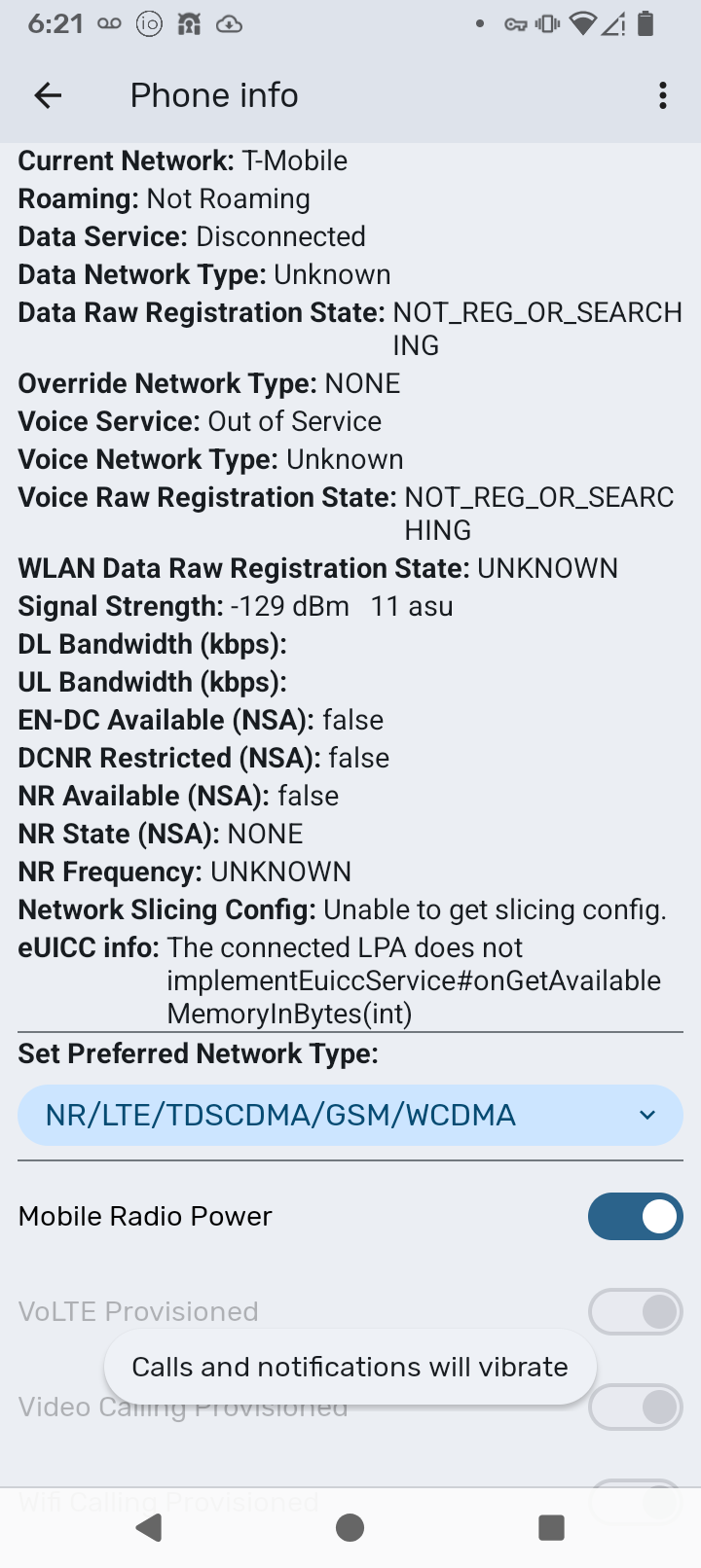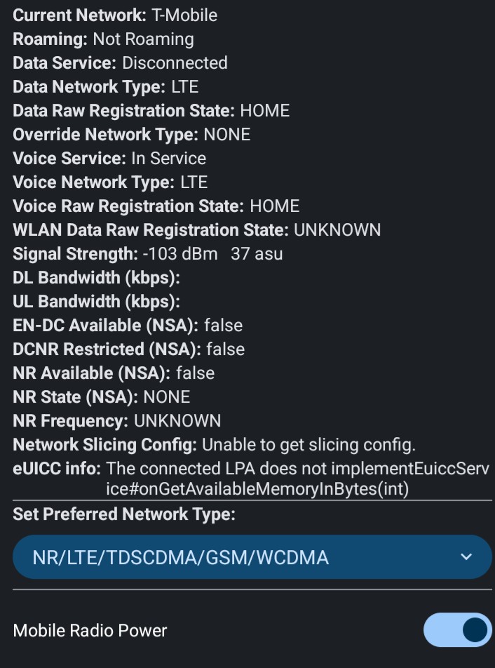 But, *#*#4636#*#* > Phone Information > 3 dots > IMS Service Status > Voice over WiFi still reported as Unavailable. I contacted my carrier (US Mobile), and they pointed me to a quick form I needed to fill on my settings page to enable “Wifi Calling” (to confirm my physical address for 911 services or some such thing).