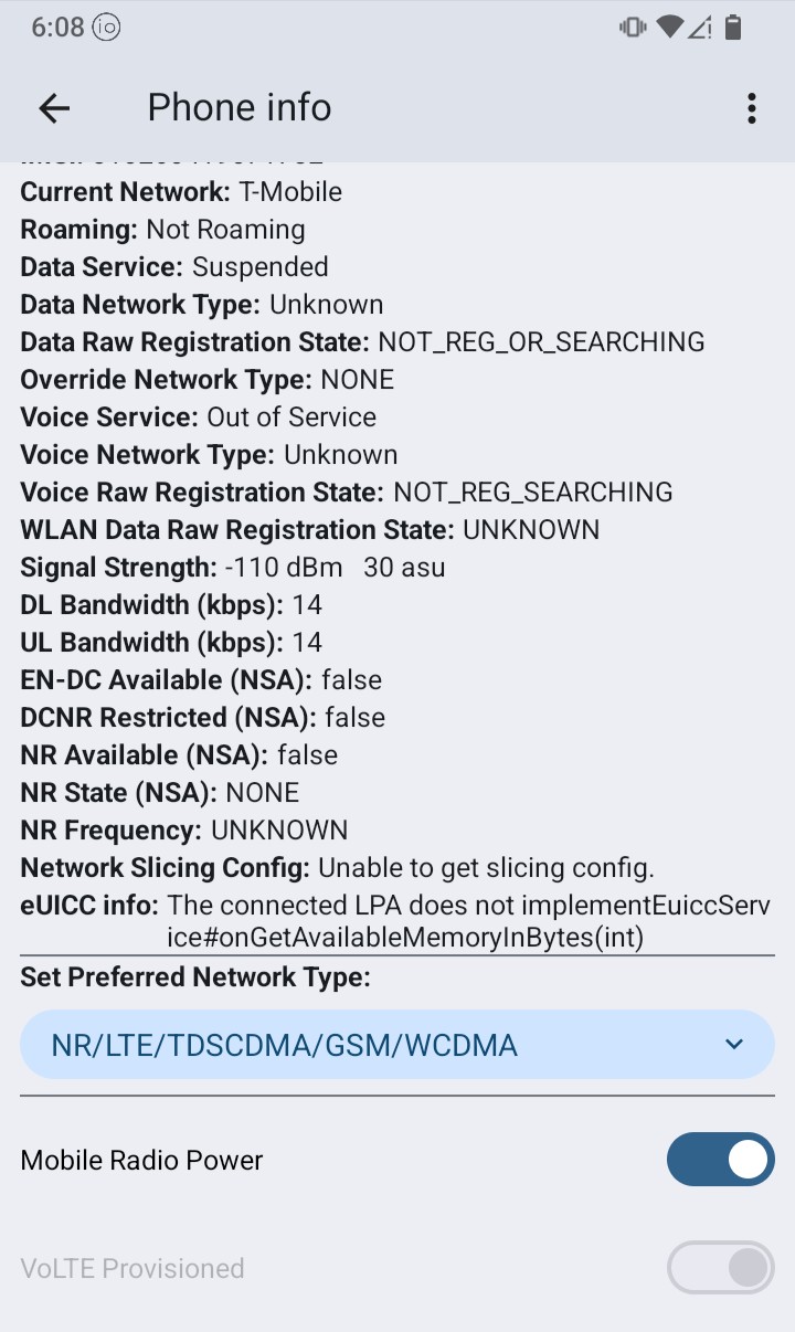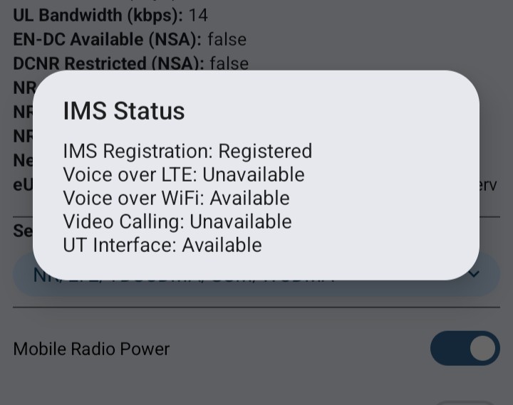 I then tried “Airplane Mode” (wifi active) and attempted a call, but the call didn’t complete. When I have airplane mode enabled, *#*#4636#*#* > Phone Information > 3 dots > IMS Service Status > Voice over WiFi still reports Available, but I get the message to “Connect to a wirelss network to make a call”.